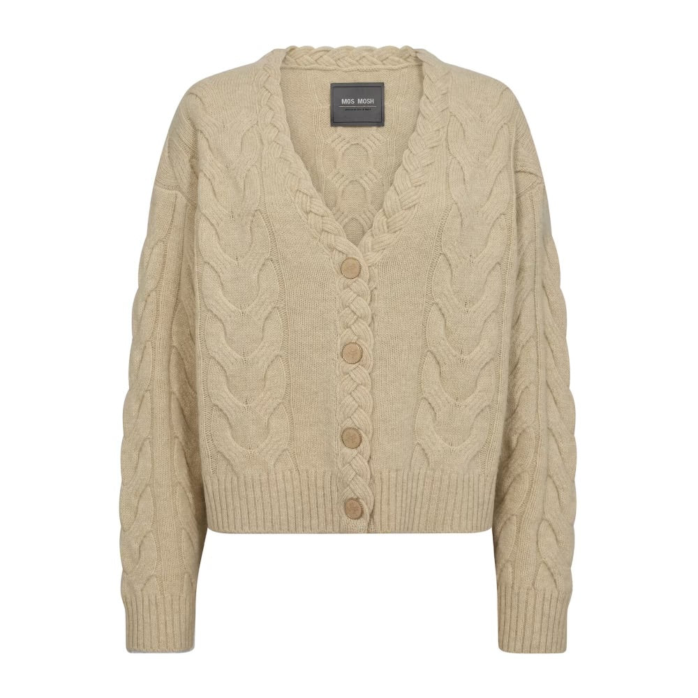 Smuk cardigan fra Mos Mosh i farven Boulder. Den er detaljeret i designet med kabelstrik, snoninger og guldknapper. Pasformen er regulær, og den er fremstillet i en virkelig blød alpaka, cashmere - og uldblanding.
