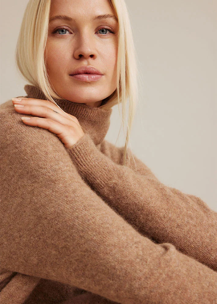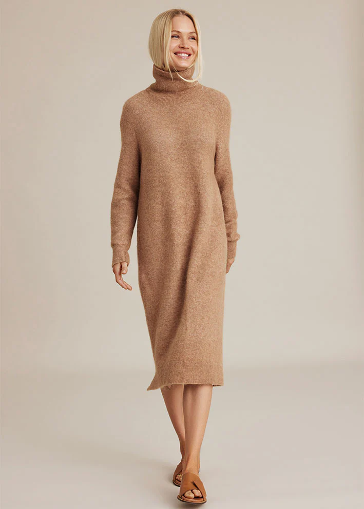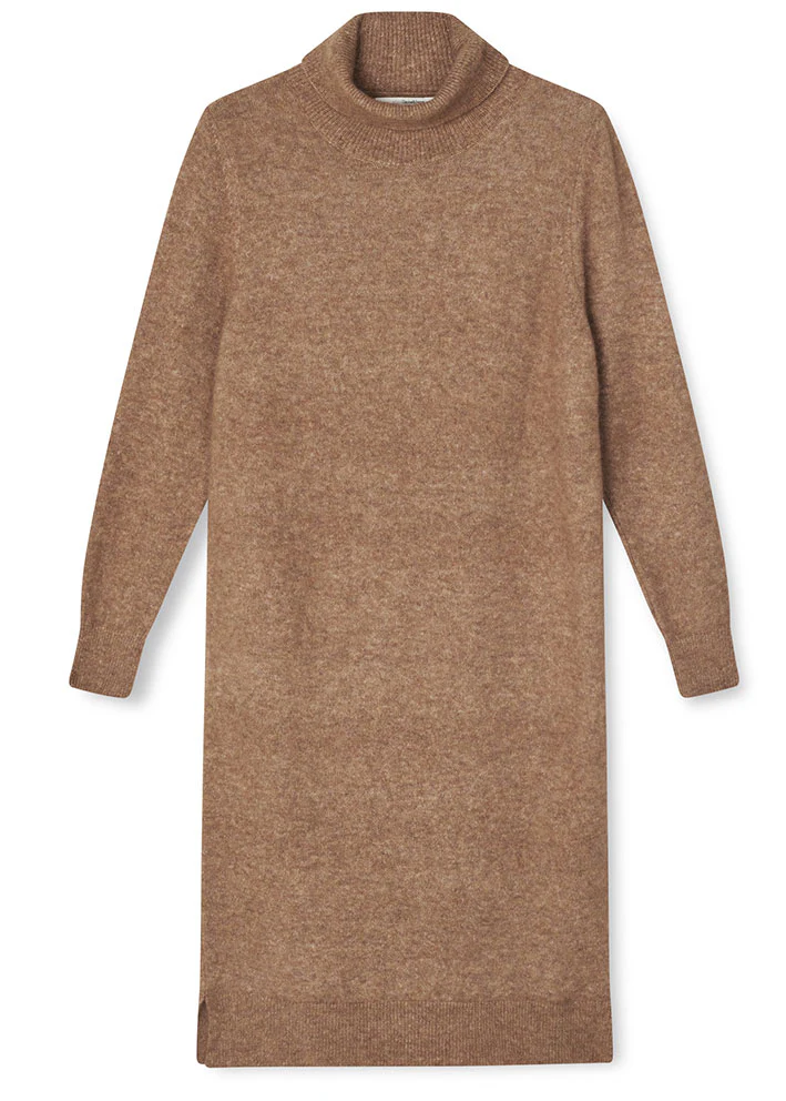 Denne utroligt lækre og bløde Madena strikkjole fra Sibin Linnebjerg er fantastisk til de kolde måneder. Den forbinder komfort med stil, og er perfekt til hverdagen. Dens varme camel farve giver et varmt look, og dens elegante detaljer tilføjer et ekstra touch. Den har ribkant detaljer ved rullekrave, ærmer og i bunden af kjolen.